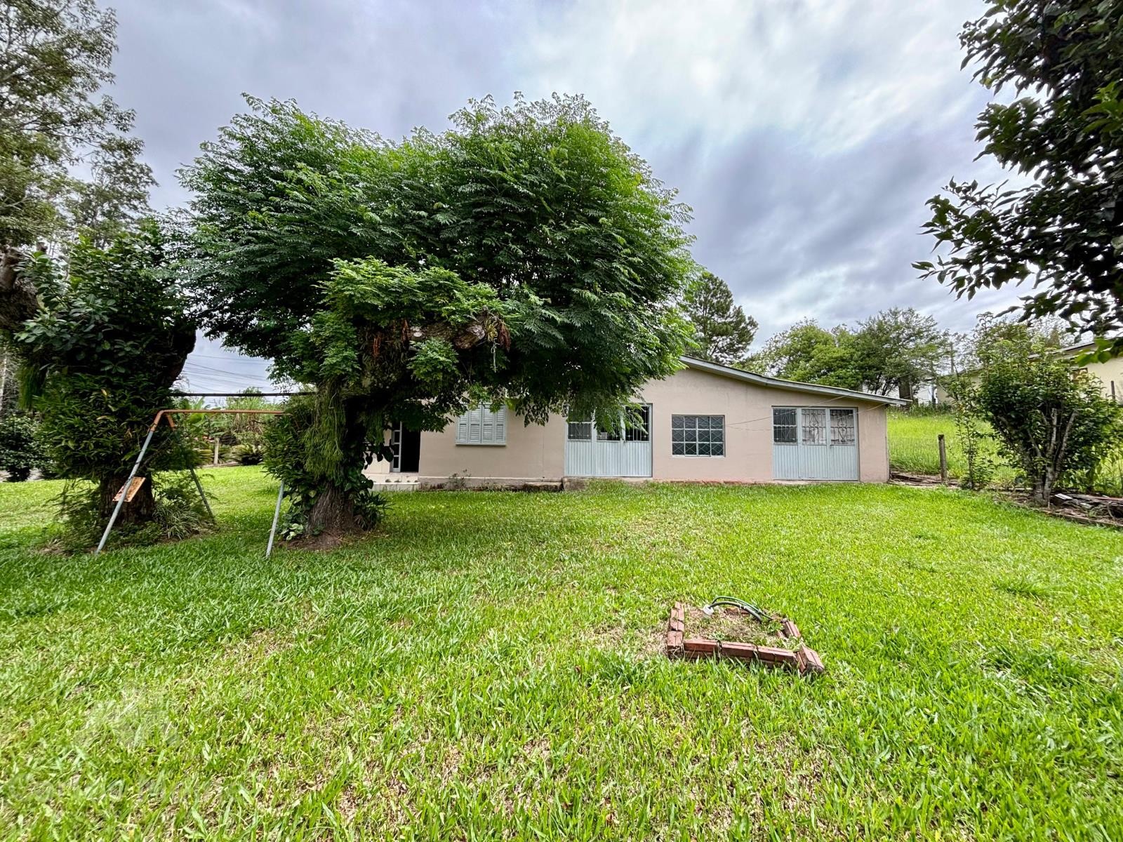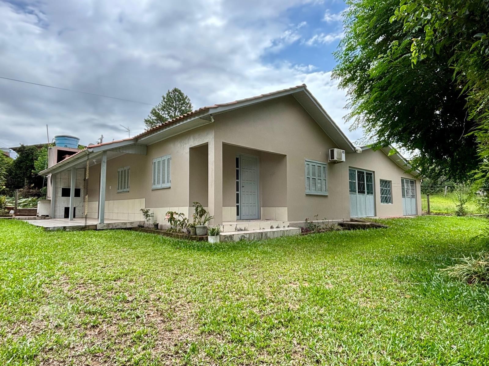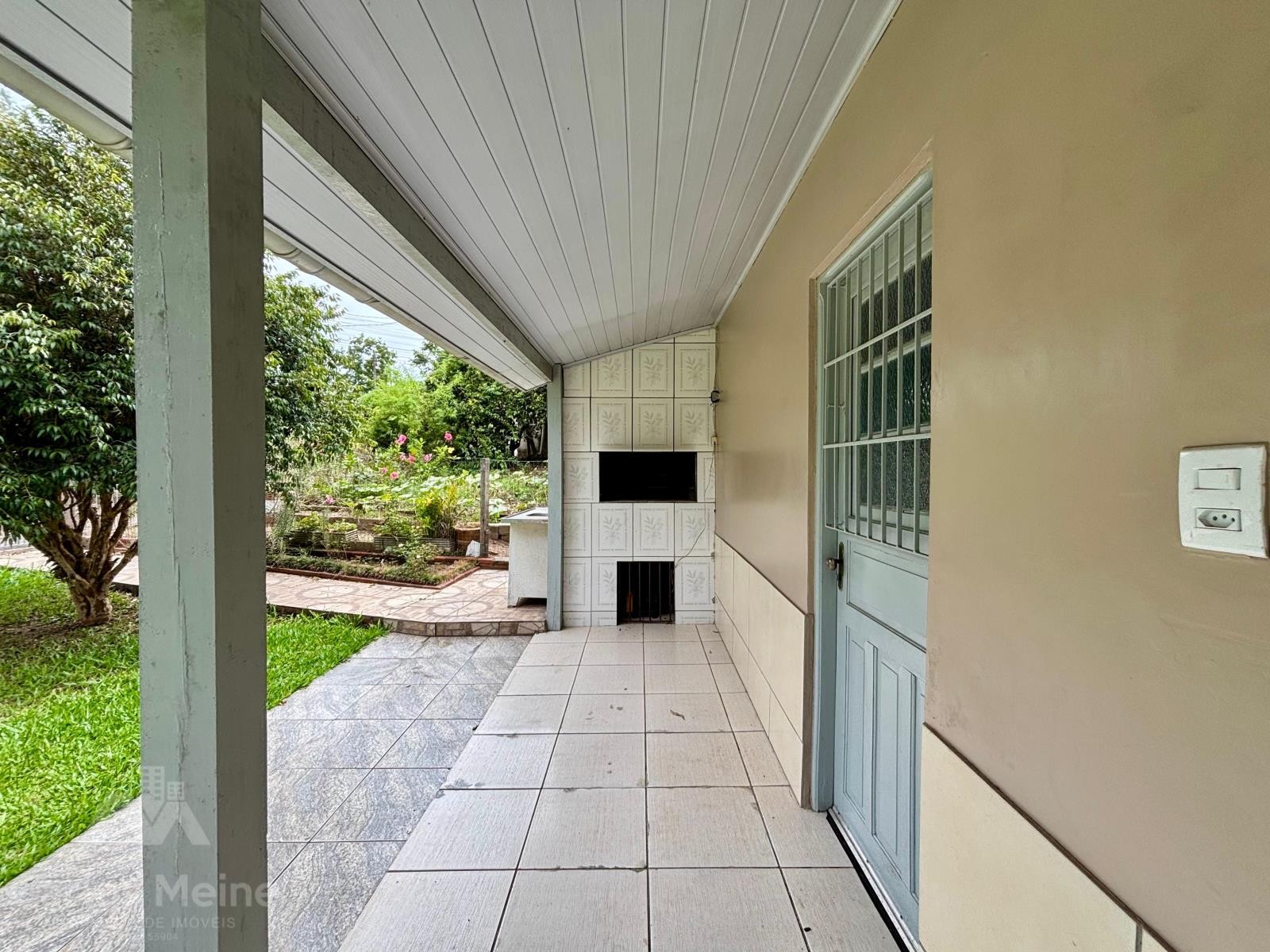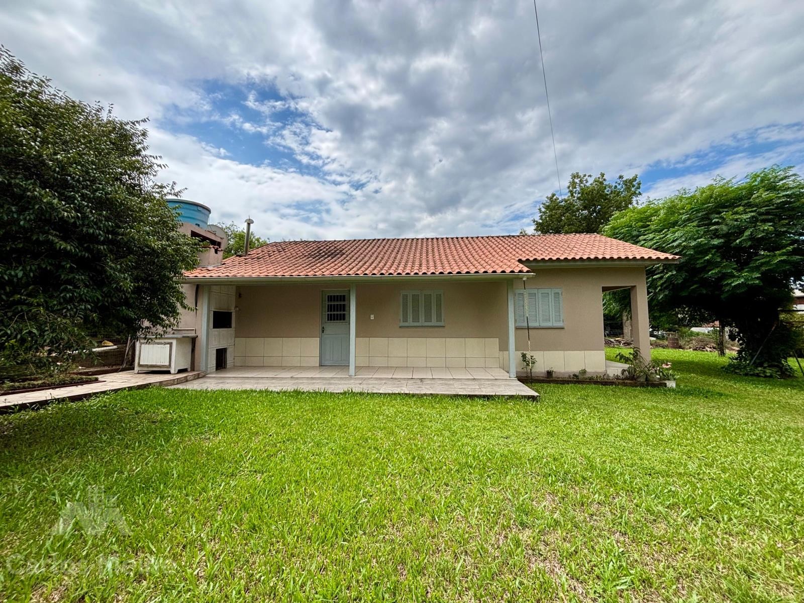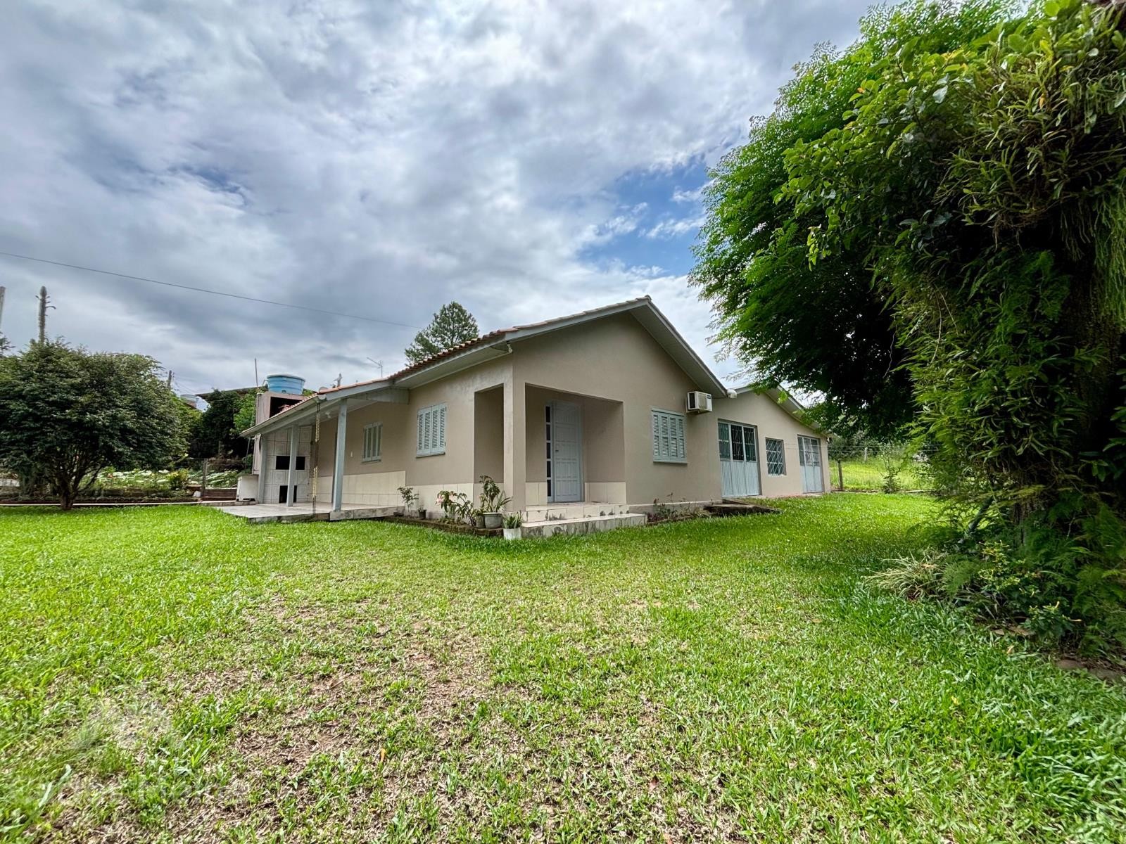 Imóvel amplo em alvenaria composto por 2 dormitórios, sala de estar e jantar em ambiente integrado, cozinha com fogão à lenha, banheiro social, garagem ampla com área de serviço e varanda com churrasqueira.