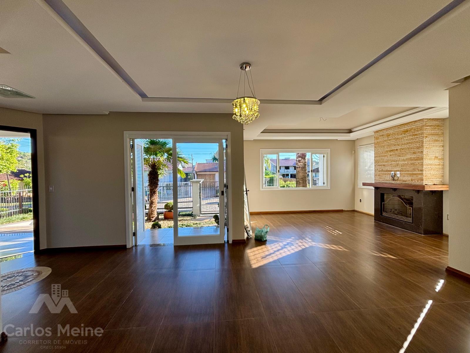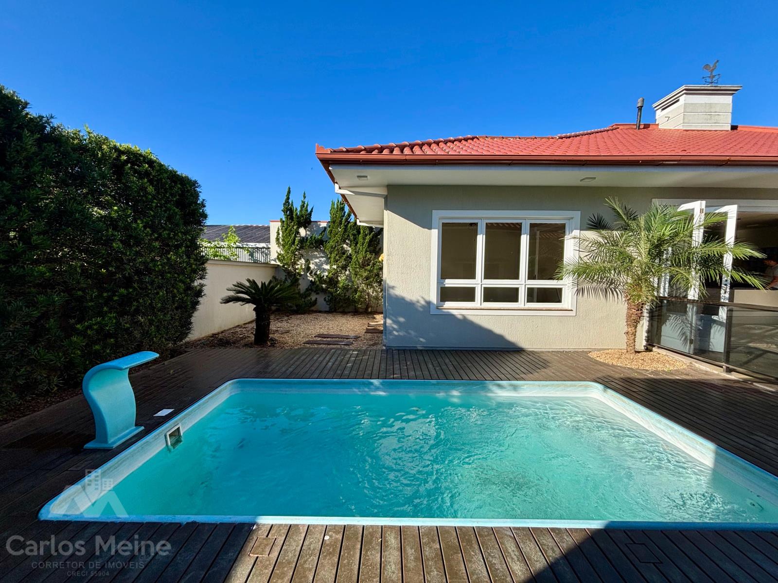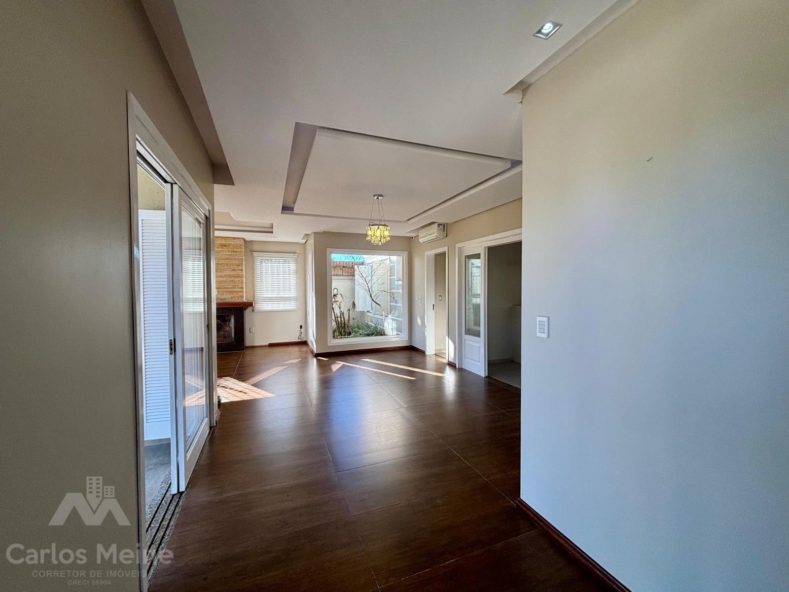 Composto por hall de entrada, sala de estar com vista para o jardim de inverno, sala de estar com lareira, cozinha ampla, banheiro social, 3 dormitórios sendo 1 suíte com closet, área de serviço, garagem para 2 carros e piscina com cascata e deck de madeira.
