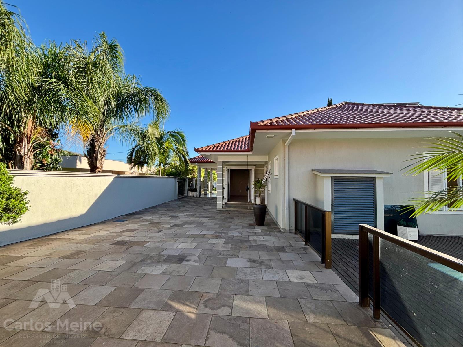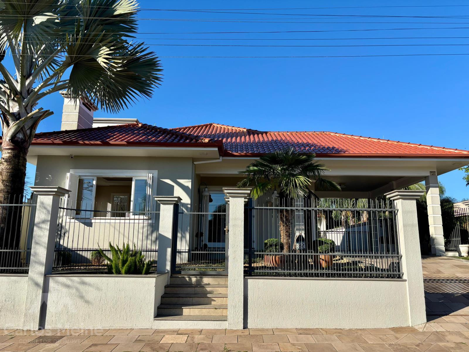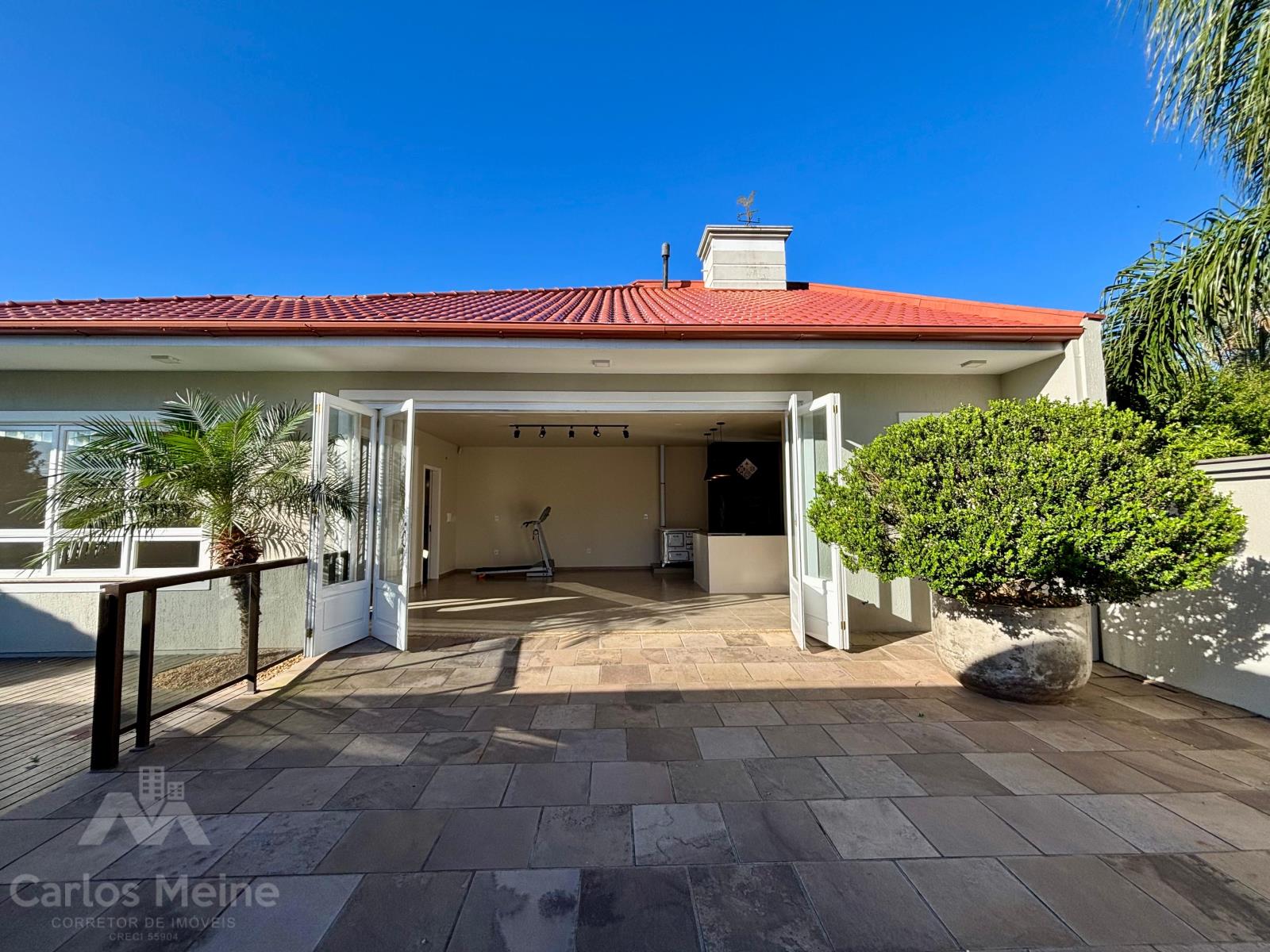 Composto por hall de entrada, sala de estar com vista para o jardim de inverno, sala de estar com lareira, cozinha ampla, banheiro social, 3 dormitórios sendo 1 suíte com closet, área de serviço, garagem para 2 carros e piscina com cascata e deck de madeira.
