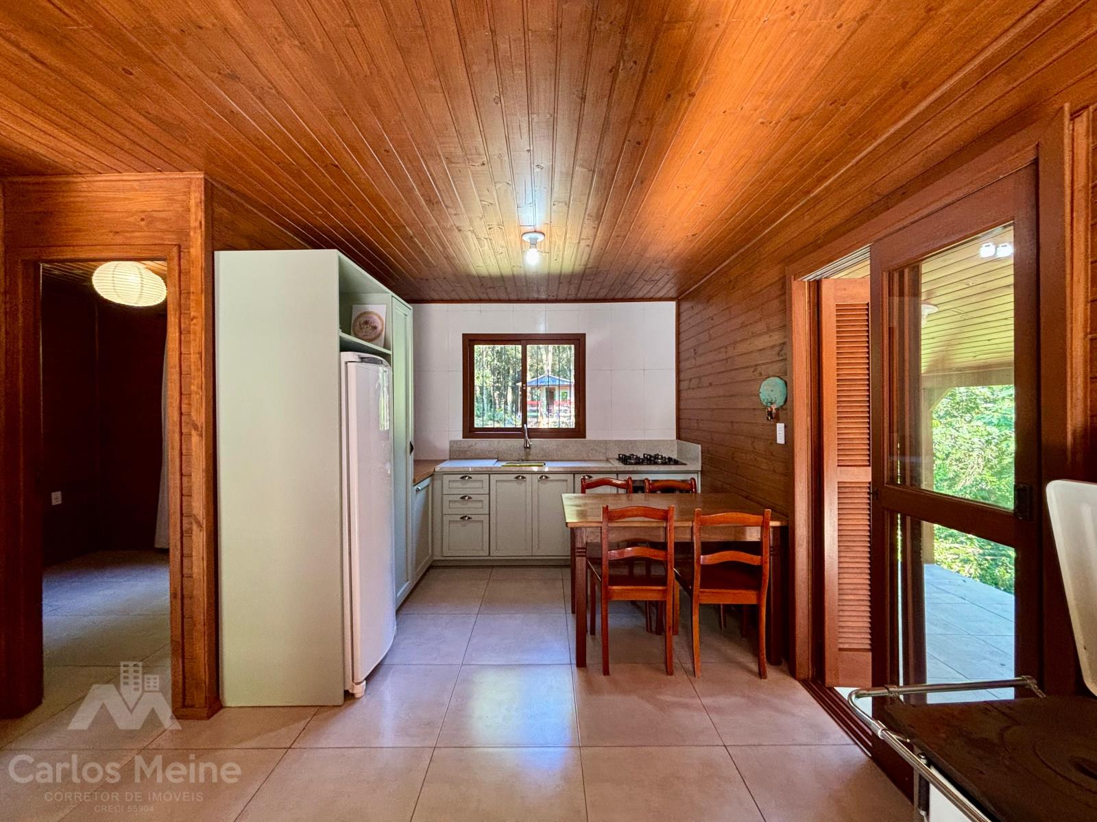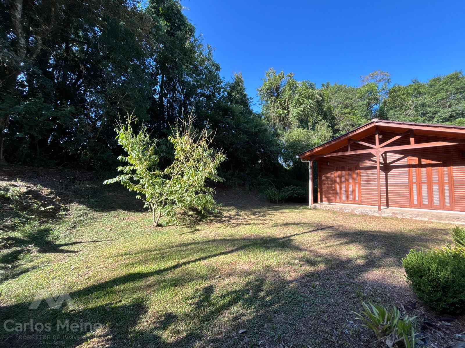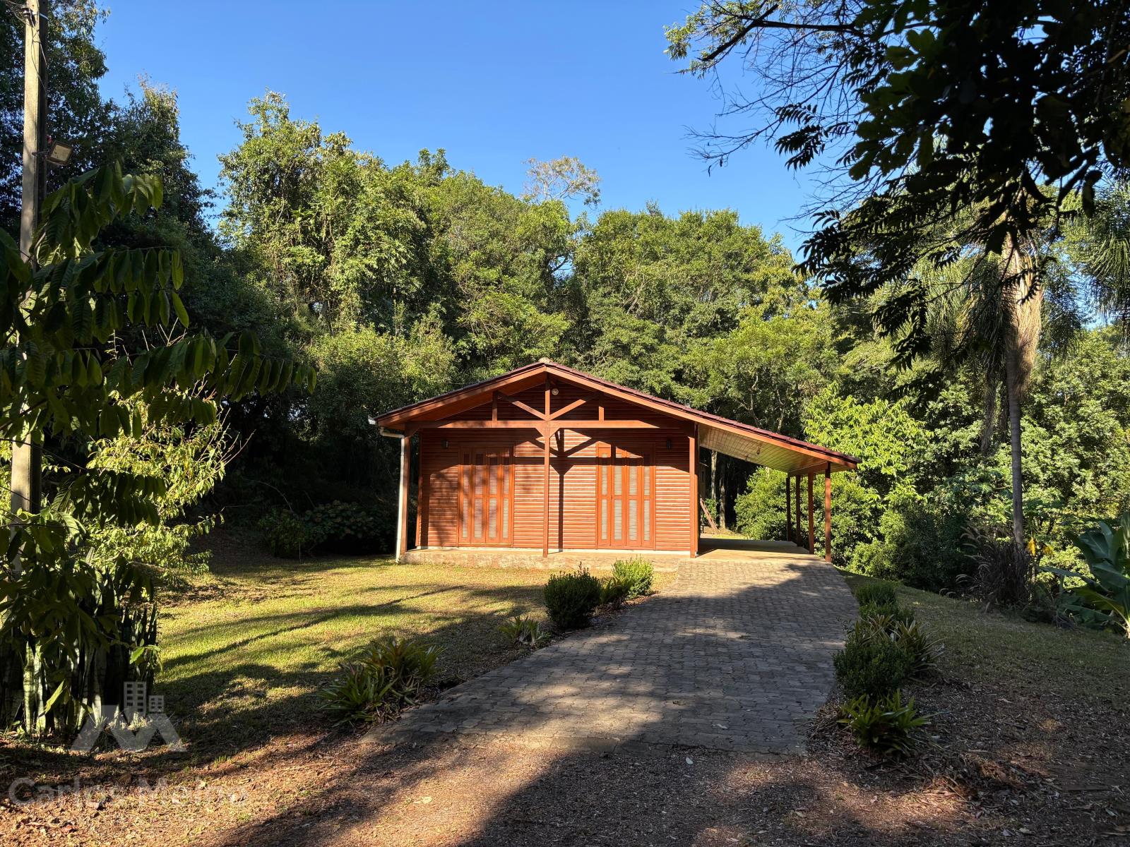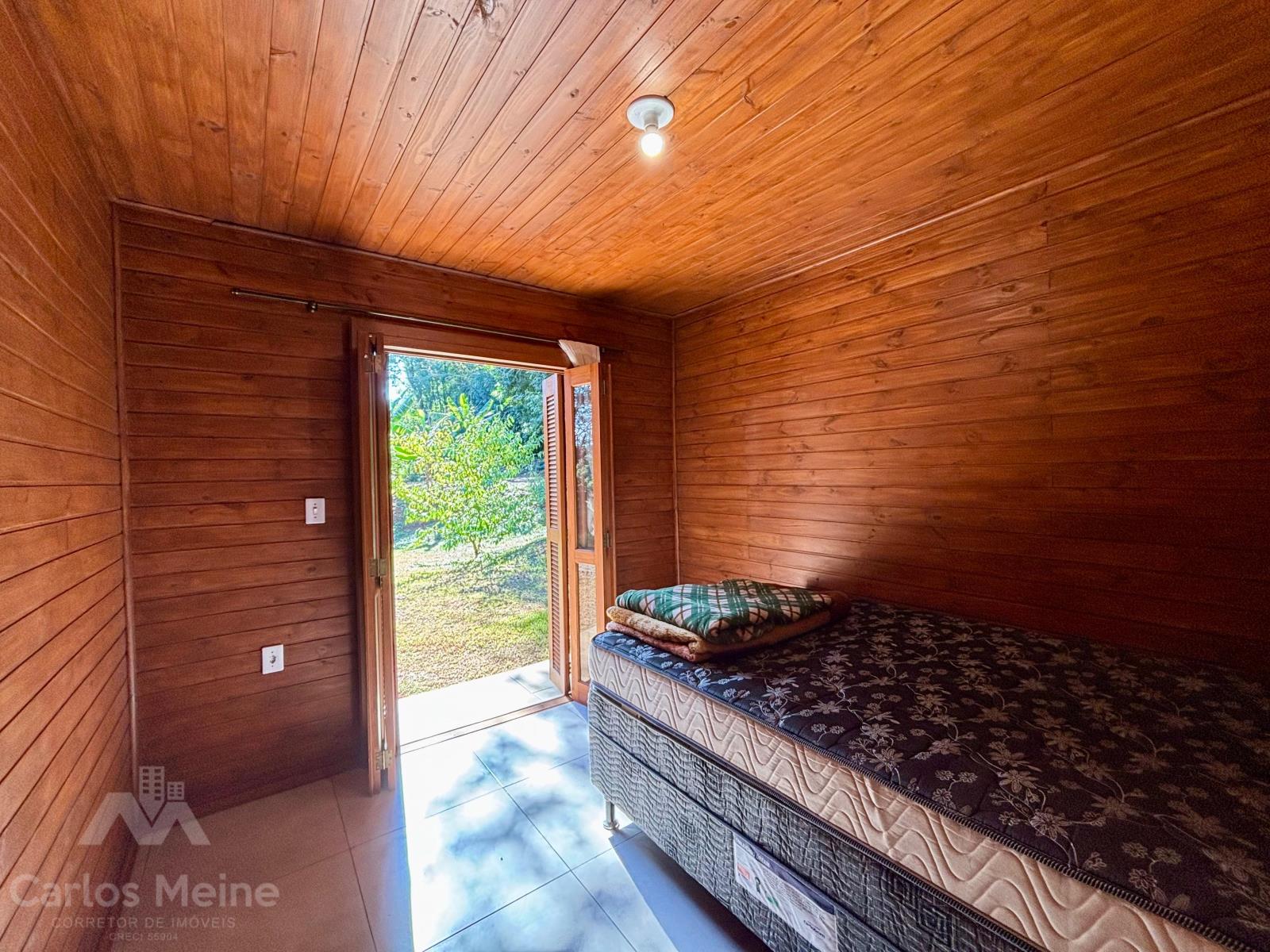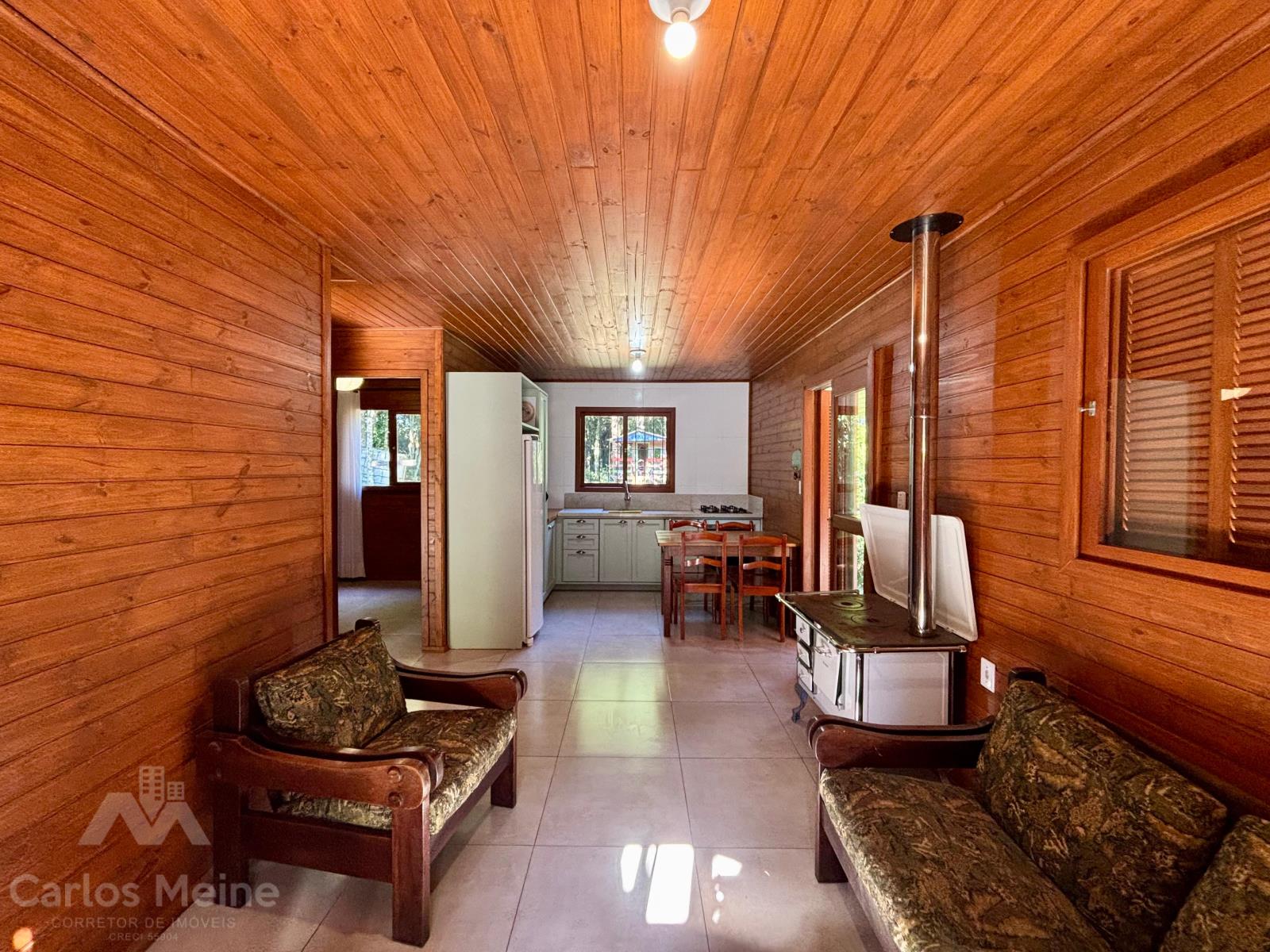 Possui um chalé amplo com aprox. 68,00m², composto por 2 dormitórios, sala de estar, cozinha com móveis sob medida, banheiro social e abrigo para carro.